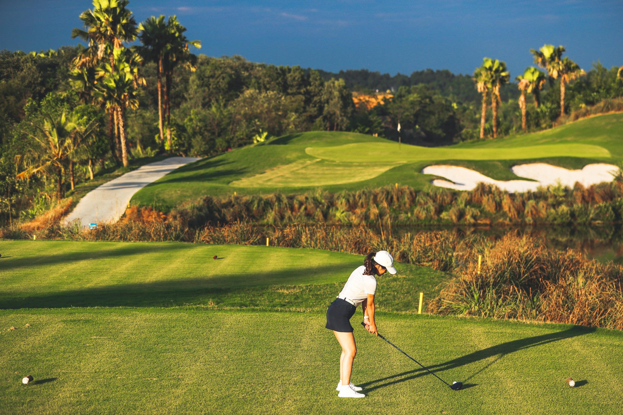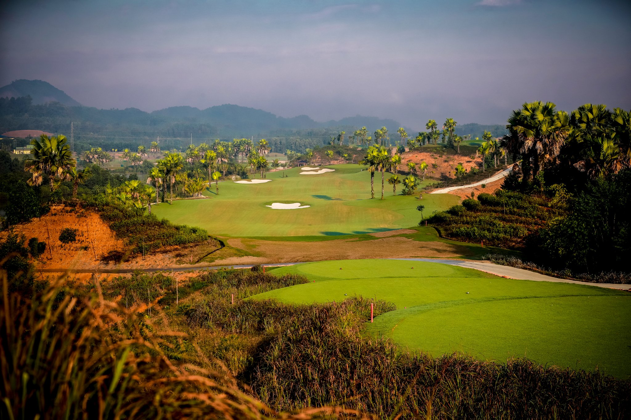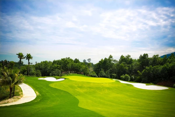 **Thử thách đồi dốc:** Địa hình nhấp nhô, uốn lượn theo đồi núi. Khu vực phát bóng (Tee box) thường nằm trên cao, tạo góc nhìn đẹp nhưng đòi hỏi kỹ thuật đánh *carry* qua các bẫy nước và độ dốc của Green.